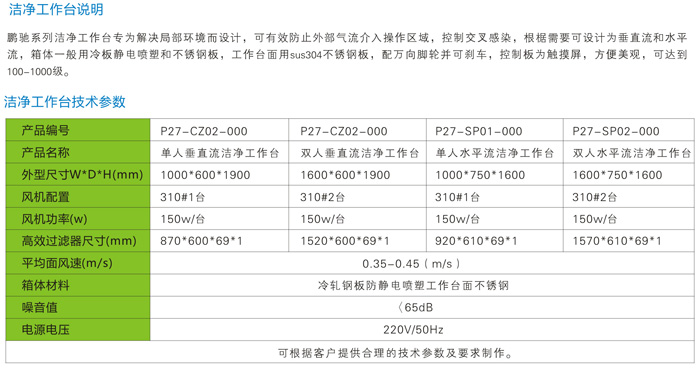 工作台由机箱、高效过滤器、可变风量送风机组、中效过滤器、工作台面、消静电离子枪等几大部件组成。机箱采用薄钢板制作,表面烤漆。工作区台面为全不锈钢结构,工作台面活动式安装,便于清洁。工作台采用了直接控制方式,设有风机开关,照明开关,消静电离子开关,直接控制设备。