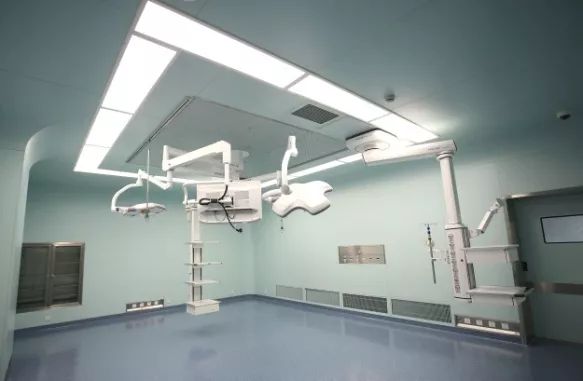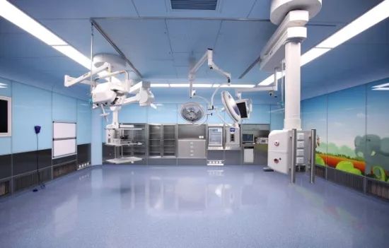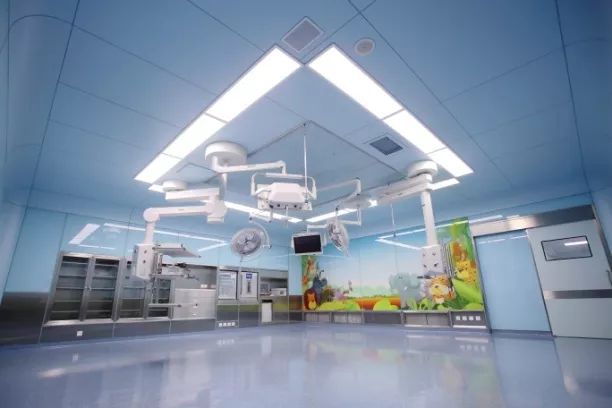 ▲ 上海儿童医学中心手术室案例 二、手术室项目亮点 01:玻璃复合手术室 手术室OP1墙板采用钢化玻璃材质,手术室墙板由地面往上840mm区域为拉丝不锈钢墙板,840mm至吊顶高度墙板为钢化玻璃墙板,C面整体为3D彩喷图案钢化玻璃墙板。 医疗卫生型钢板加医用专用玻璃的墙板表面平滑无气孔、有防撞、易清洁、美观、降低回声的优势,冷色调不容易产生视觉疲劳。 手术室墙面利用专用龙骨挂件、连接件,安装简单、高效,易检修、易扩展。本项目采用最新 工厂预制化生产技术,生产出手术室模块化配件,现场组装,并根据医院现场条件进行优化组合。