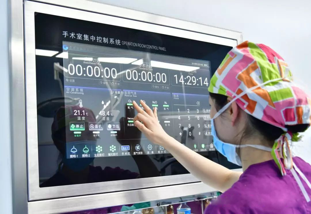 记者环顾室内发现,手术室一侧的墙上有触屏,名为“手术室集中控制系统”,可以显示温度、湿度、静压差、中心供氧等等,“这就是层流手术室的‘定海神针’, 手术室的清洁、手术开展的相关监测全靠它来保障!不仅设有时钟、计时钟、温湿度控制器,还有照明、空调机组、对讲系统等;你瞧,它还可以播放音乐,舒缓手术人员的情绪呢……”