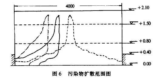 根据分析发现,在不同室宽和回风口百叶高度的情况下,均没有明显涡流区产生。这与目前流行的观点:此类洁净手术室中央将有一个明显的涡流三角区相悖,但却与某洁净手术室的实测结论相吻合,见图4。因此,笔者认为在这种洁净手术室中部即或有涡流三甬区出现都是很微弱的,其紊动程度不至影响到工作区的流场