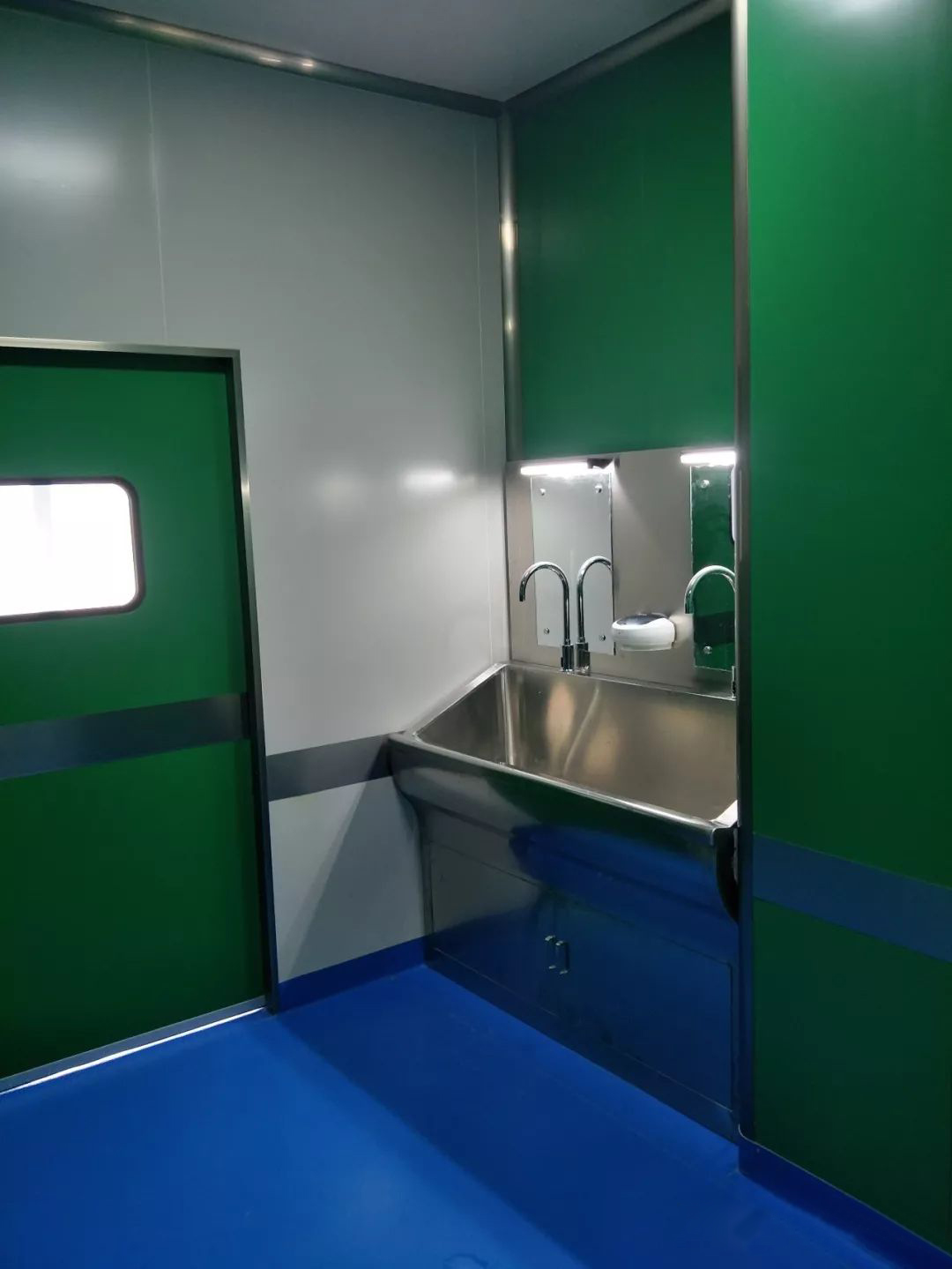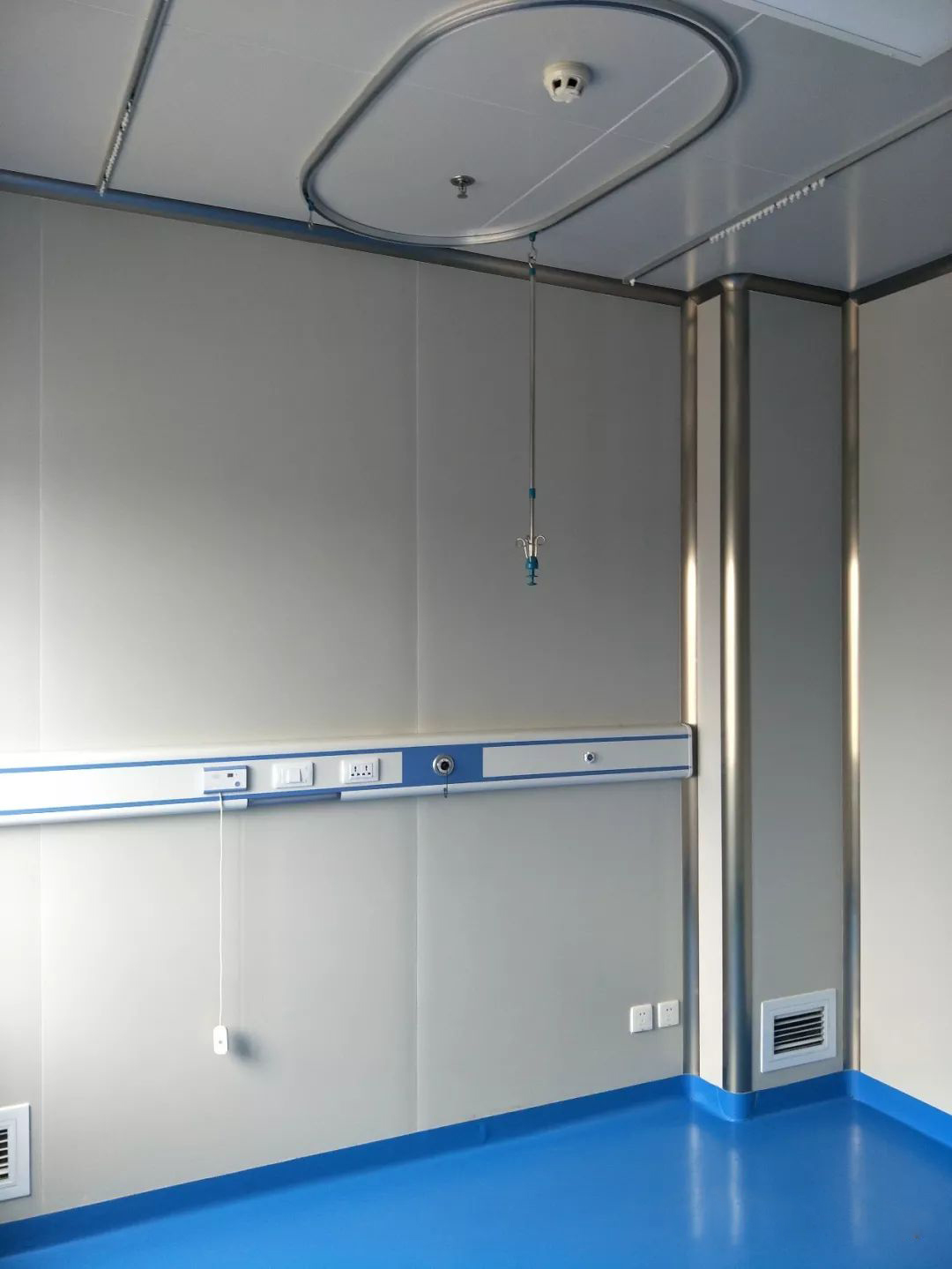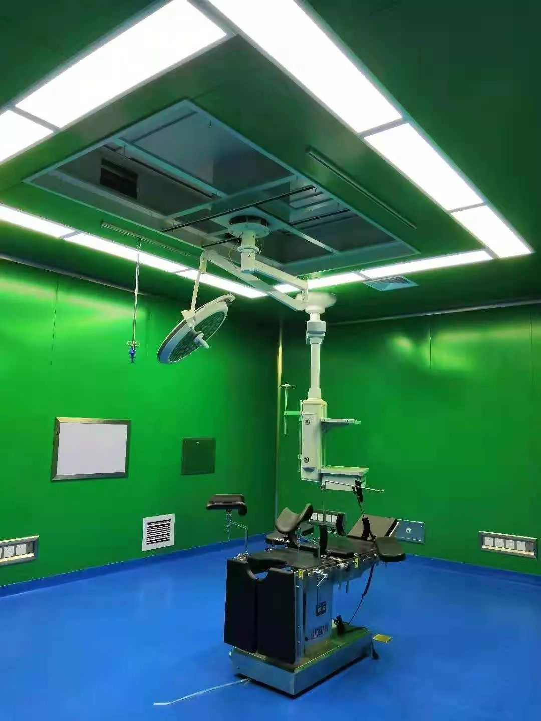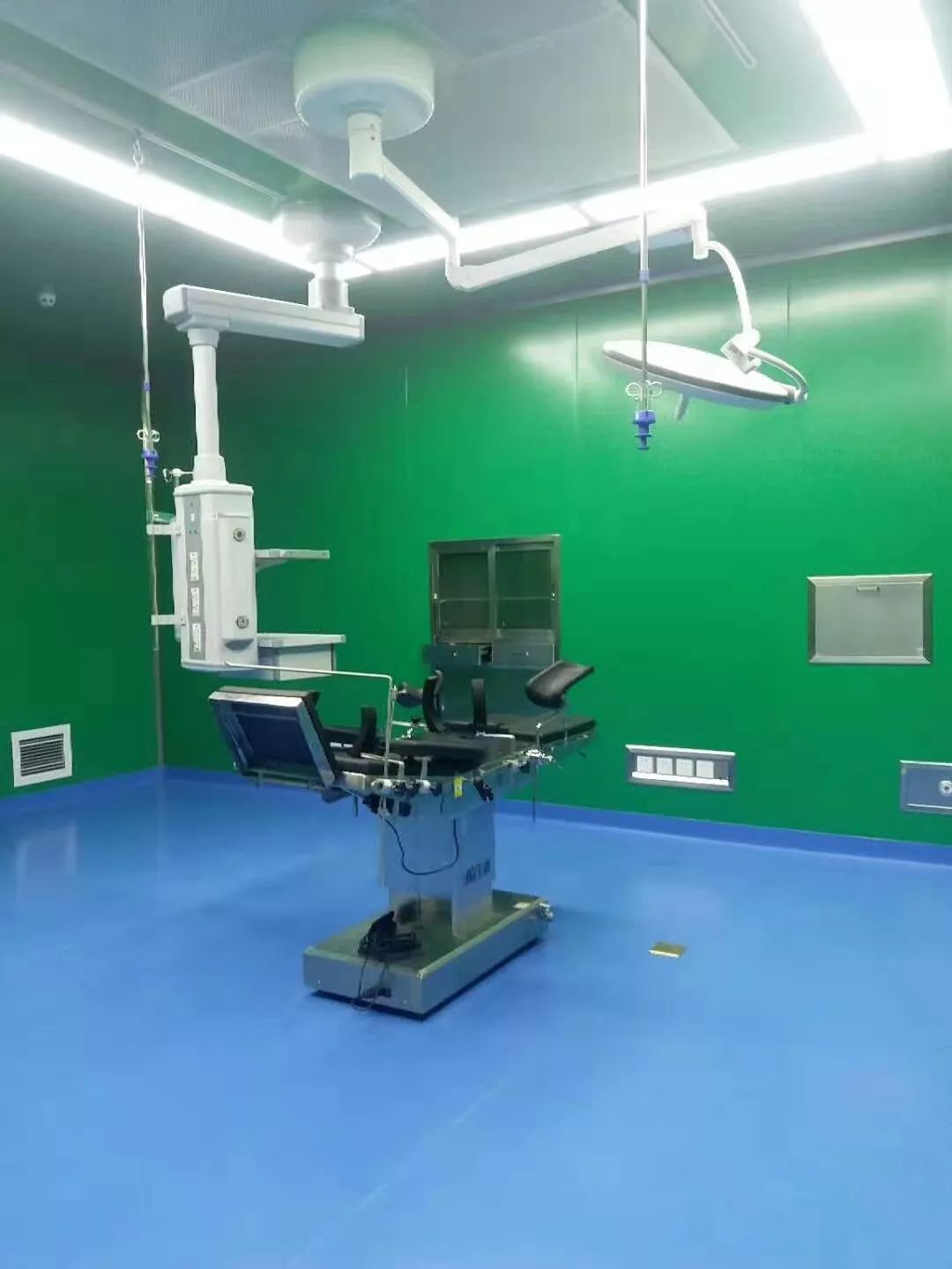 本工程为手术室净化建设工程。设计房间包含无菌物品存放、气瓶间、手术室(洁净等级Ⅲ级)、护士站、污物通道、苏醒室、洁净通道等。墙体采用机制电解板龙骨架结构,配以铝合金辅材,吊顶采用快装电解板。房间地面采用PVC卷材地面,厚度2.0mm。