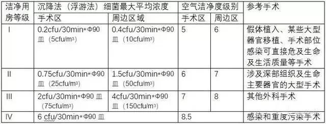 洁净手术室的等级标准的指标应符合下表的要求: