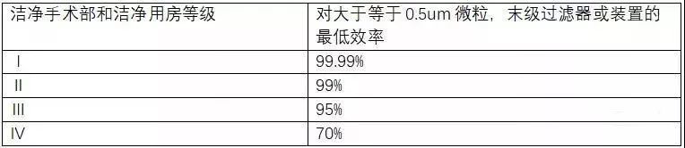 各级洁净手术室和洁净用房送风末级过滤器或装置的最低过滤效率下表的规定: